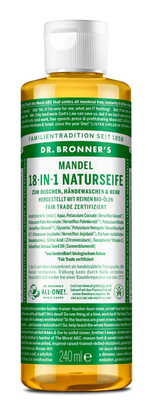 Tekuté univerzální mýdlo ALL-ONEDr. Bronner´s s přírodní mandlovou parfemací je vyrobené z kombinace bio panenského kokosového, olivového, jojobového a konopného oleje, které tvoří jedinečné přírodní mýdlo. Mýdlo díky přírodní parfemaci voní jako sladký marcipán. Vytvoří jemnou pěnu, která šetrně myje pokožku či vlasy, vyčistí zuby, umyje nádobí či vypere prádlo.