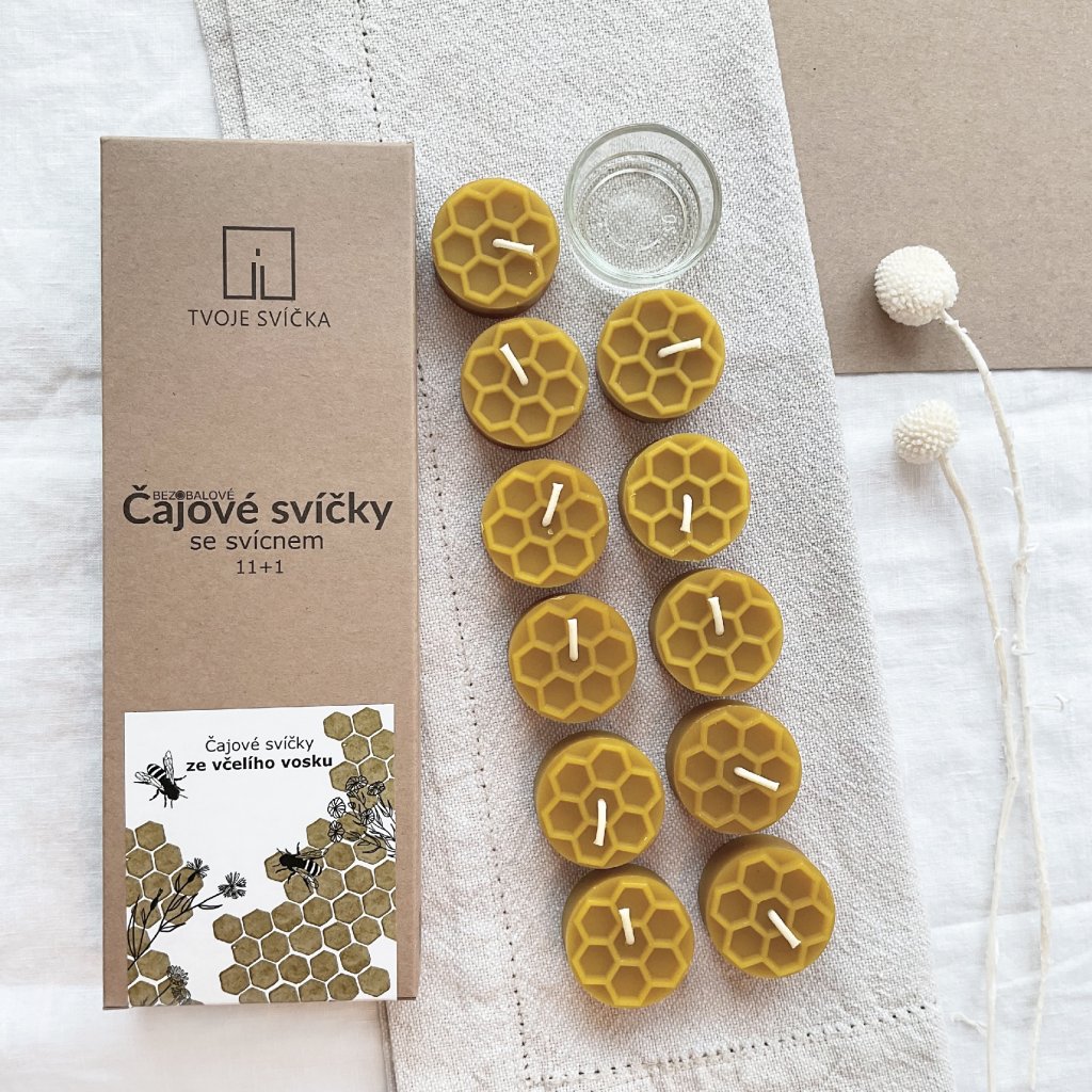 • TVOJE SVÍČKA Čajové svíčky ze včelího vosku se svícnem (11+1)